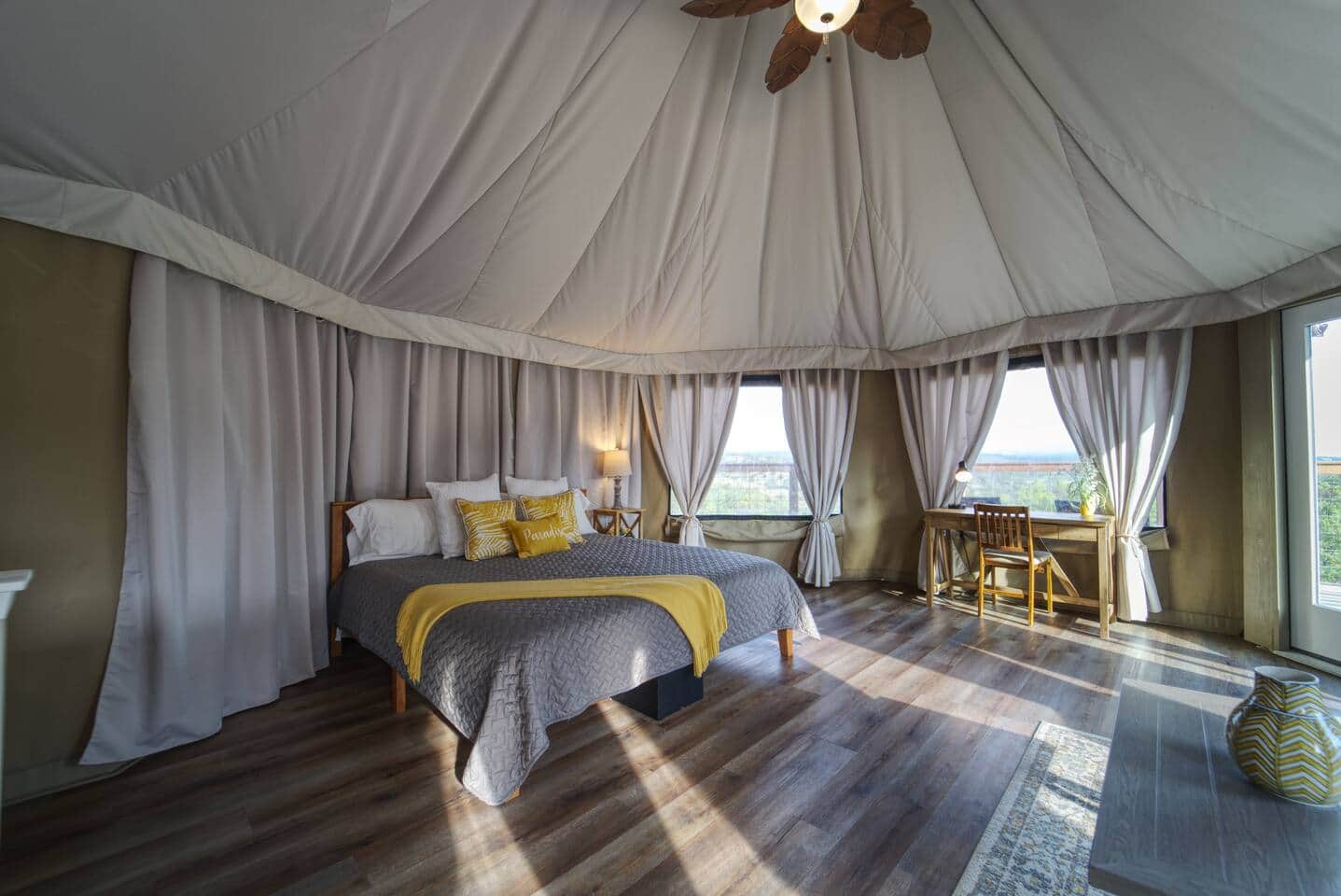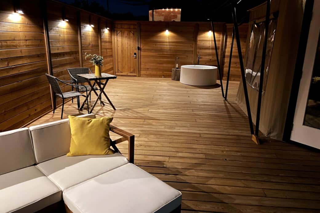 The property features 4 luxury tents each with their own private deck and courtyard. The community area features a binzebo with a bar, gas grill, dining area, hot tub and lounging under the stars.